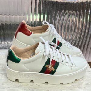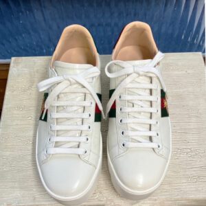 今回はGUCCI グッチのライトン トリコロールラインのホワイトスニーカーです。全体に黒いよごれがつき、少しくたびれてしまった印象になっておりました。